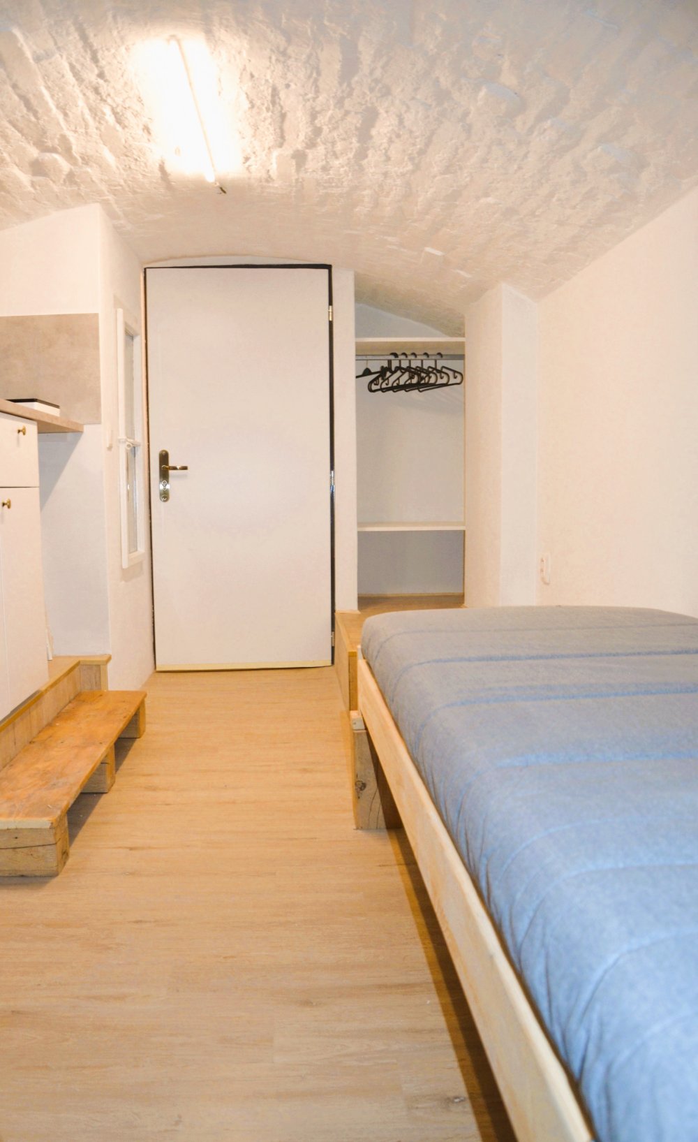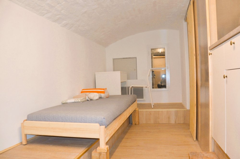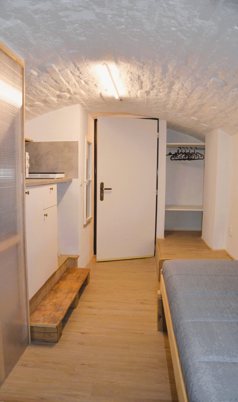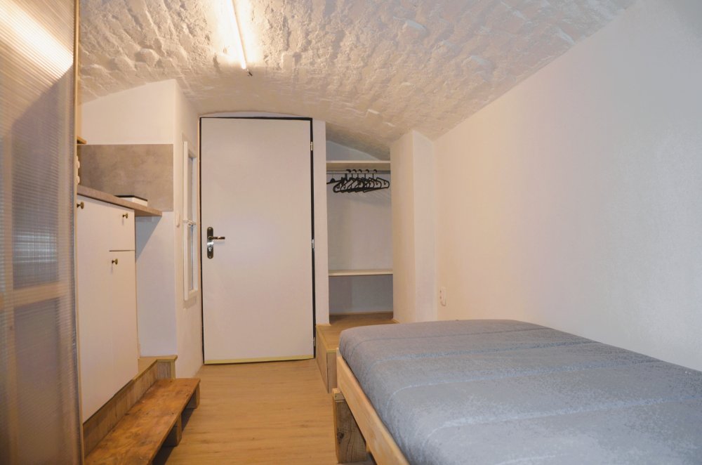 Studio je zařízené nábytkem – jednolůžkovou postelí, stolem se židlí a úložnými prostory v podobě výklenku ve zdi a skříně s policemi.