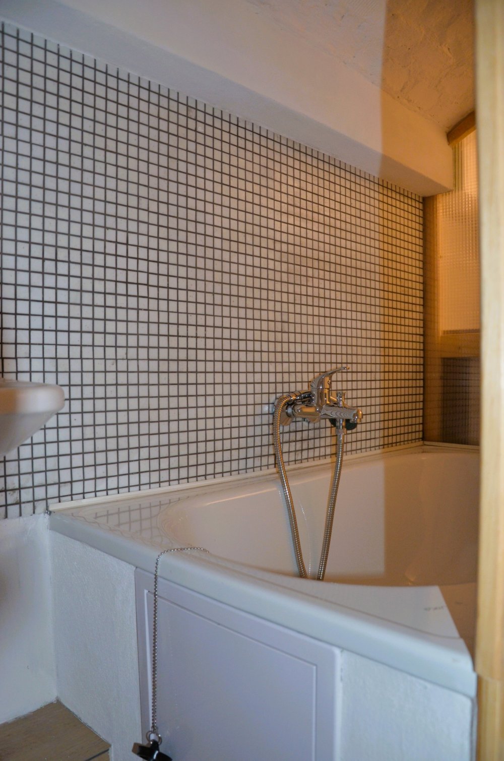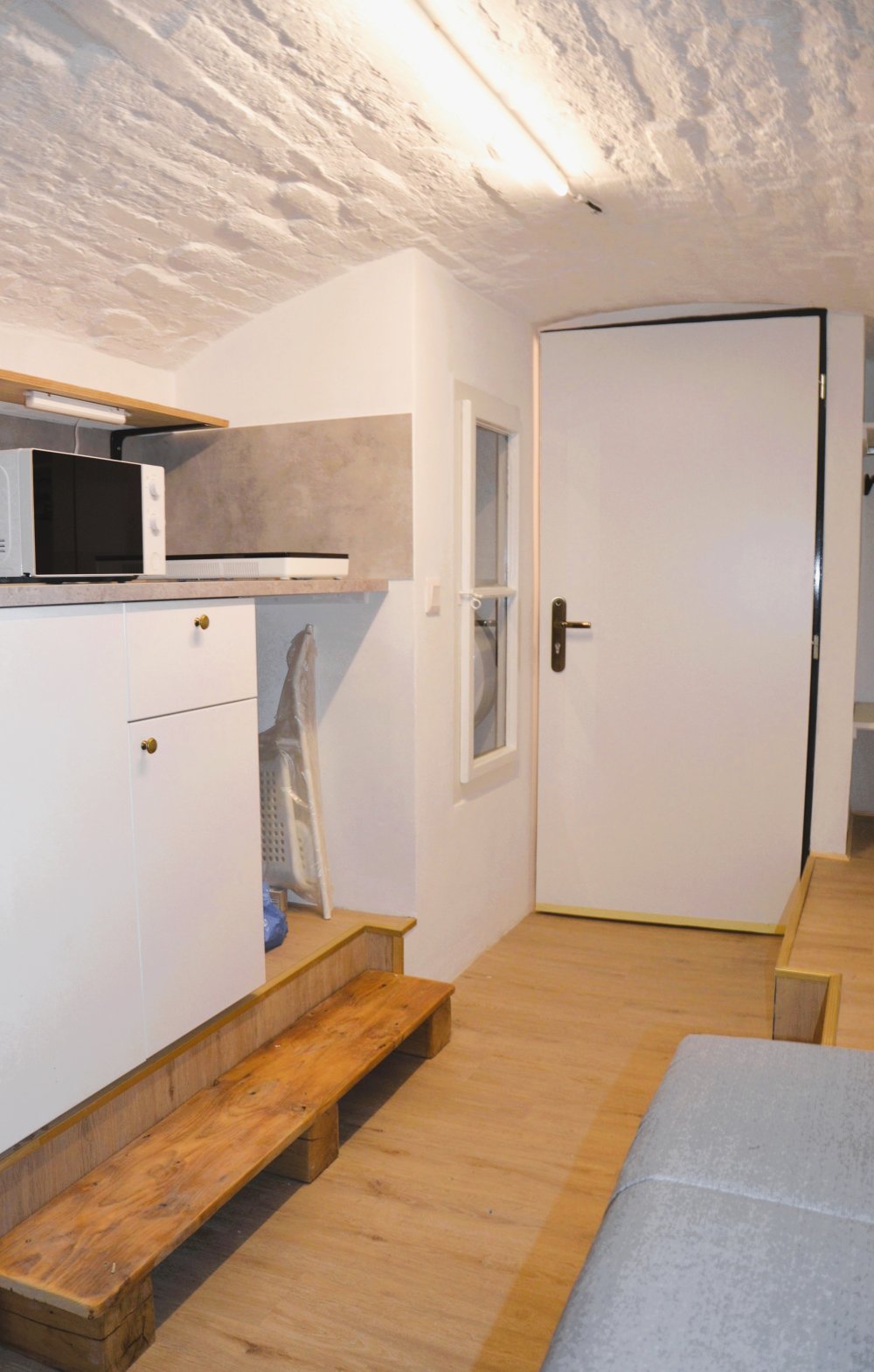 Byt právě prošel rekonstrukcí a je vybaven malou kuchyňskou linkou s elektrickou plotýnkou, mikrovlnnou troubou a malou lednicí s mrazákem. K dispozici je také základní kuchyňské vybavení, ložní prádlo a ručníky. Součástí bytu je menší koupelna s toaletou, umyvadlem a vanou.